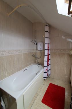 Three piece white coloured suite comprising of push button WC, wash hand basin with shavers light above and bath with Mira Elite SE electric shower; large Velux window is a good source of light; fully tiled floor to ceiling.